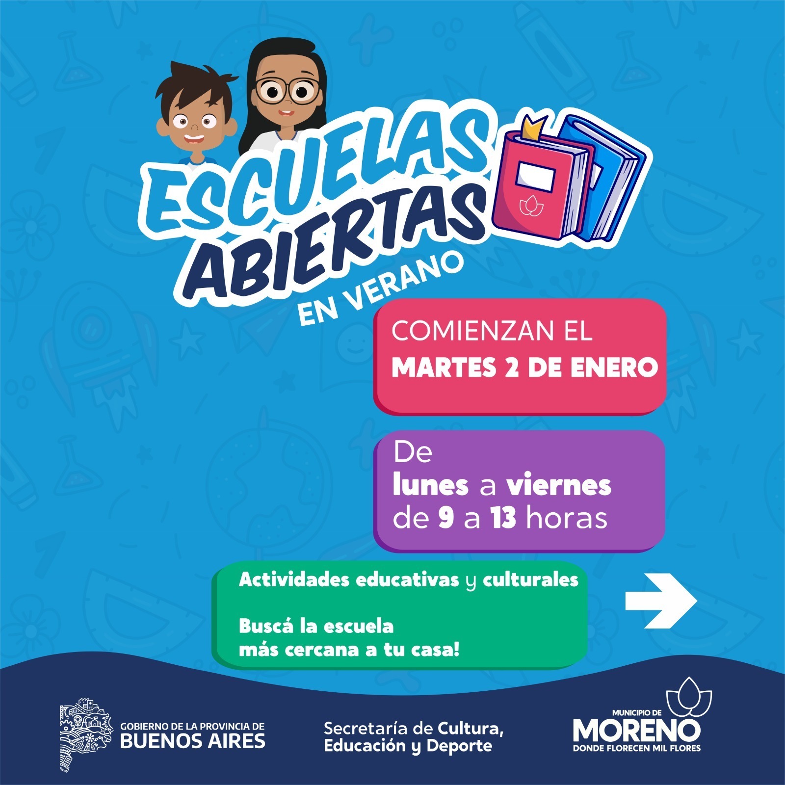 El Municipio de Moreno, a través de la Secretaría de Cultura, Educación y Deporte, llevará adelante el programa “Escuelas abiertas en verano” a partir del día 2 de enero, hasta el 2 de febrero.