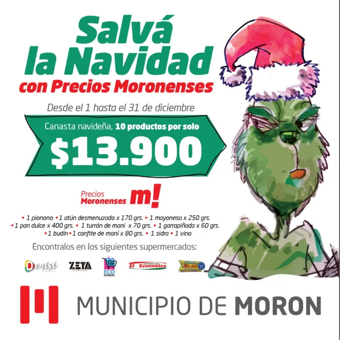 Durante diciembre, los supermercados de Morón ofrecerán una canasta navideña por $13.900. Incluye 10 productos esenciales para las celebraciones, como atún, pionono, pan dulce, turrón y sidra, entre otros.